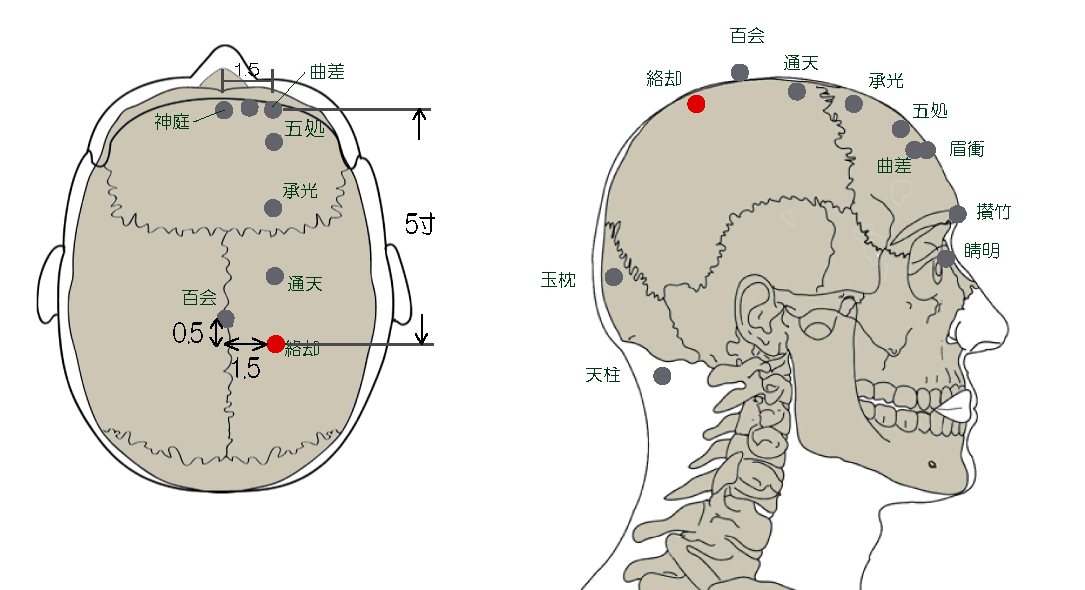 ◇絡却(一名,強陽、一名,脳蓋):通天後一寸五分。『素註』刺三分、留五呼。『銅人』灸三壮。
