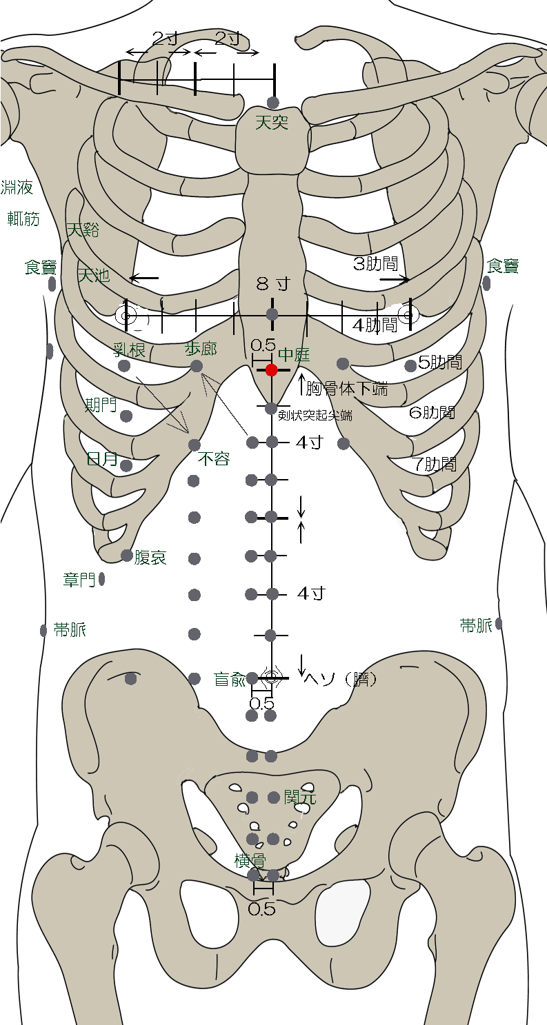 『甲乙経』巻三 ◆胸自天突循任脉下行至中庭凢七穴第十四 中庭、在膻中下一寸六分陷者中、任脉氣所發、仰而取之、刺入三分、灸五壯。
