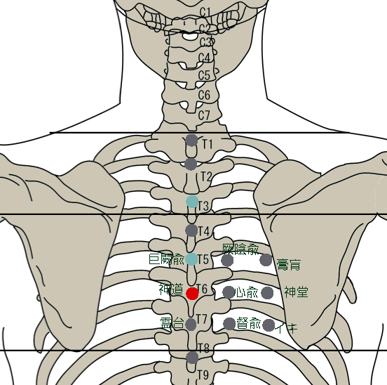 『甲乙経』巻三 ◆背自第一椎循督脉行至脊骶凢十一穴第七 神道、在第五椎節下間、督脉氣所發、俛而取之、刺入五分、畱(留)五呼、灸三壯。